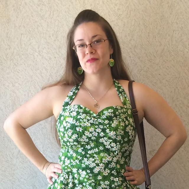 I must admit that I was a bit unsure about this dress at first. Princess seams and halters usually aren't my thing: I need a more defined waist, and strapless/convertible bras make me entirely despondent. However, I was utterly taken with this gorgeous daisy print, and as it only came in this dress and the twirl skirt, I decided to give princess seams and a halter neck a shot.